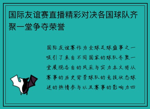 国际友谊赛作为全球足球盛事之一,吸引了来自不同国家的球队齐聚一堂,展现各自的风采与实力。本文将从赛事的历史背景、球队的竞技状态、球迷的热情参与以及赛事的影响力四个方面进行详细阐述。通过对这些方面的分析,我们将更深入地理解国际友谊赛的意义,以及它在促进各国文化交流和增进友谊方面的重要作用。